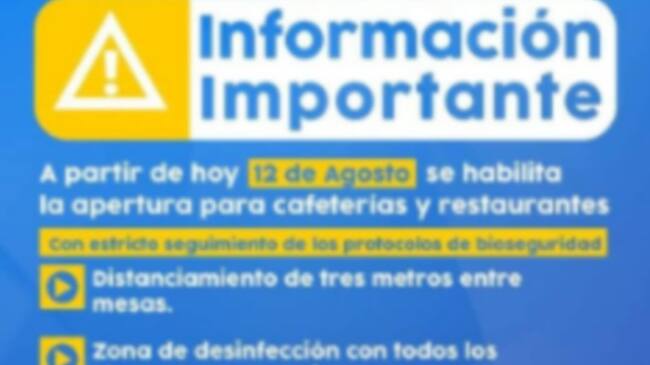 El alcalde de Aranzazu, Caldas, José Lisímaco Amador Cuestas dio a conocer que a partir de hoy 12 de agosto los restaurantes y cafeterías de su municipio podrán reabrir y atender de manera presencial.