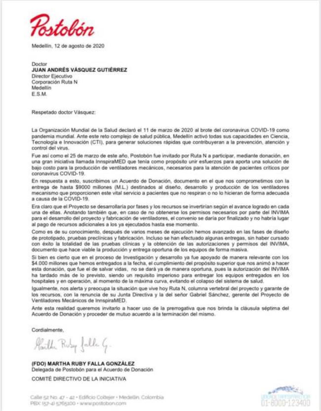 La compañía Postobón anunció a través de una carta que retira su apoyo financiero a La iniciativa de ventiladores mecánicos desarrollados en Antioquia llamada #InspiraMED, que está articulada por Ruta N y financiada por Postobón.