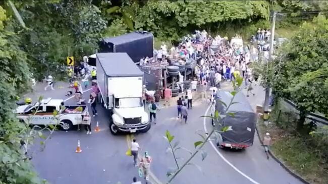Alrededor de 50 personas en el sector la Quiebra, del municipio de Santa Bárbara, Antioquia, saquearon un camión que se volcó en el km 17 con productos de aseo, las imágenes muestran cómo estas personas hacen cadenas humanas para pasarse los productos a pesar de la presencia de policía.