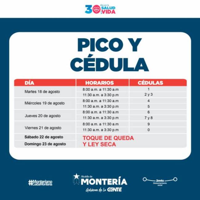 La Alcaldía de Montería se acogió al decreto departamental que extiende la ley seca y toque de queda durante el mes de agosto y mantendrá las restricciones con el pico y cédula.