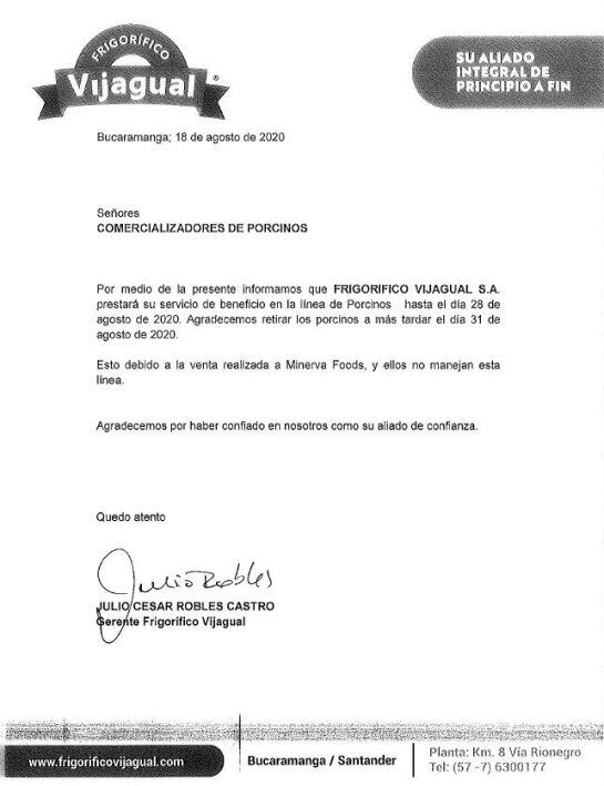 Una carta de los nuevos propietarios del frigorífico Vijagual cayó como "un baldado de agua fría" entre los porcicultores de Santander; en la misiva, la empresa Athena Foods S.A, anuncia que prestará la línea de beneficio porcino hasta el 28 de agosto. Por tal motivo, piden a los propietarios de los animales retirarlos a más tardar el lunes 31 de agosto.