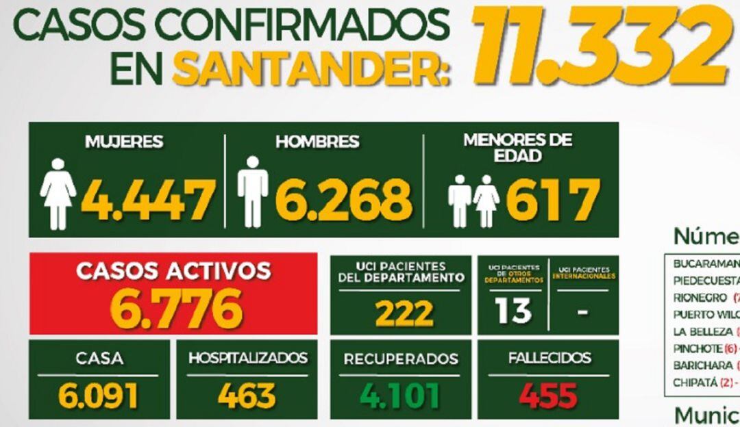Además, se reporta 630 nuevos contagios en el departamento. Los pacientes están ubicados en Aratoca (3), Barrancabermeja (117), Bucaramanga (278), Charalá (3), Cimitarra (4), Curití (2), El Carmen de Chucurí (2), El Socorro (4), Floridablanca (105), Girón (30), Lebrija (6), Málaga (2), Oiba (1), Piedecuesta (46), Puerto Wilches (6), Sabana de Torres (1), San Gil (16), San José de Miranda (1), Santa Helena del Opón (1) y Vetas (2).