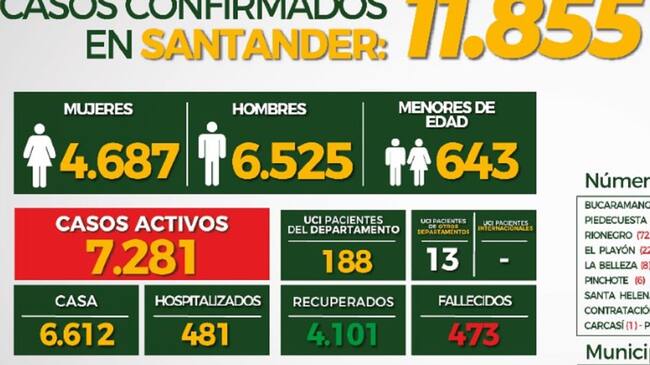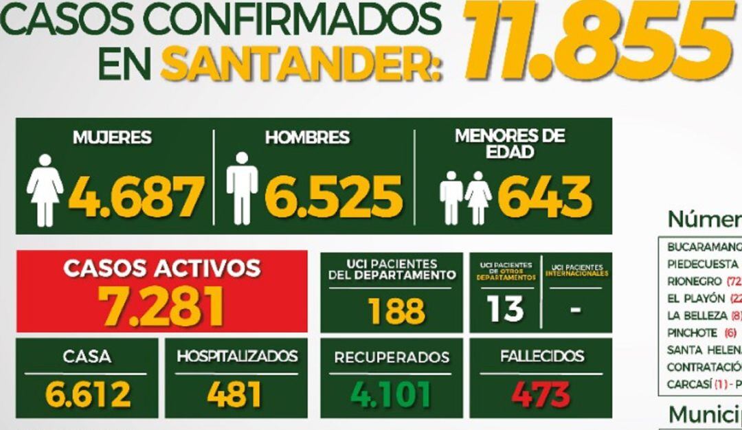 Igualmente se reportaron 523 nuevos contagios en personas residentes en los municipios de Barrancabermeja (69), Bucaramanga (227), Charalá (1), Cimitarra (4), Floridablanca (105), Girón (43), Lebrija (3), Mogotes (3), Piedecuesta (35), Puerto Wilches (5),Sabana de Torres (10), San Gil (17) y Vélez (1).