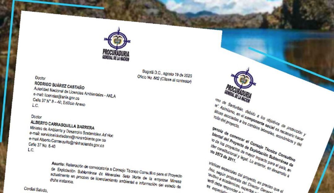 La Procuraduría General de la Nación le solicitó a la Autoridad Nacional de Licencias Ambientales, ANLA, y al Ministro de Ambiente y Desarrollo Sostenible ad hoc, Alberto Carrasquilla Barrera, activar con urgencia el Consejo Técnico Consultivo para el proyecto de Explotación Subterránea de Minerales Soto Norte de la empresa Minesa en el Páramo de Santurbán.