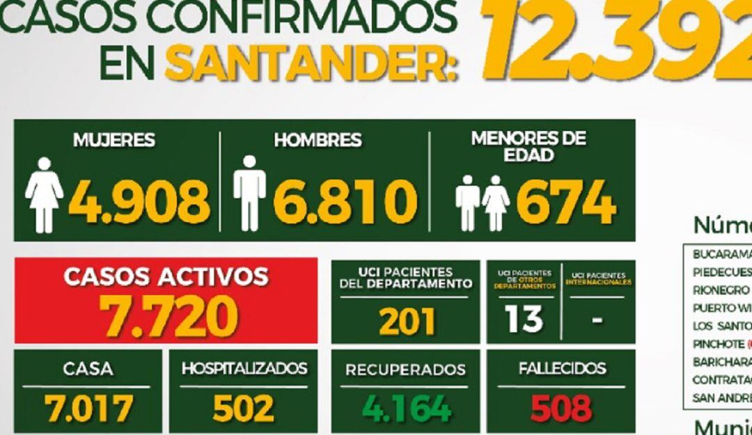 En el departamento hay 47 municipios con el virus activo: Aratoca (5), Barbosa (8), Barichara (2), Barrancabermeja (1.255), Betulia (2), Bolívar (1), Bucaramanga (3.438), Capitanejo (1), Carcasí (1), Cerrito (1), Charalá (9), Chipatá (1), Cimitarra (80), Contratación (2), Curití (5), El Carmen de Chucurí (3), El Playón (19), El Socorro (13), Floridablanca (1.310), Girón (569), Guaca (2), Guavatá (1), Landázuri (5), Lebrija (43), Los Santos (3), Málaga (36), Matanza (4), Mogotes (8), Molagavita (4), Oiba (3), Onzaga (2), Piedecuesta (545), Pinchote (4), Puerto Parra (1), Puerto Wilches (15), Rionegro (44), Sabana de Torres (50), San Andrés (1), San Gil (143), San José de Miranda (4), San Vicente de Chucurí (57), Santa Helena del Opón (2), Suaita (3), Tona (3), Vélez (8), Vetas (2) y Zapatoca (2).