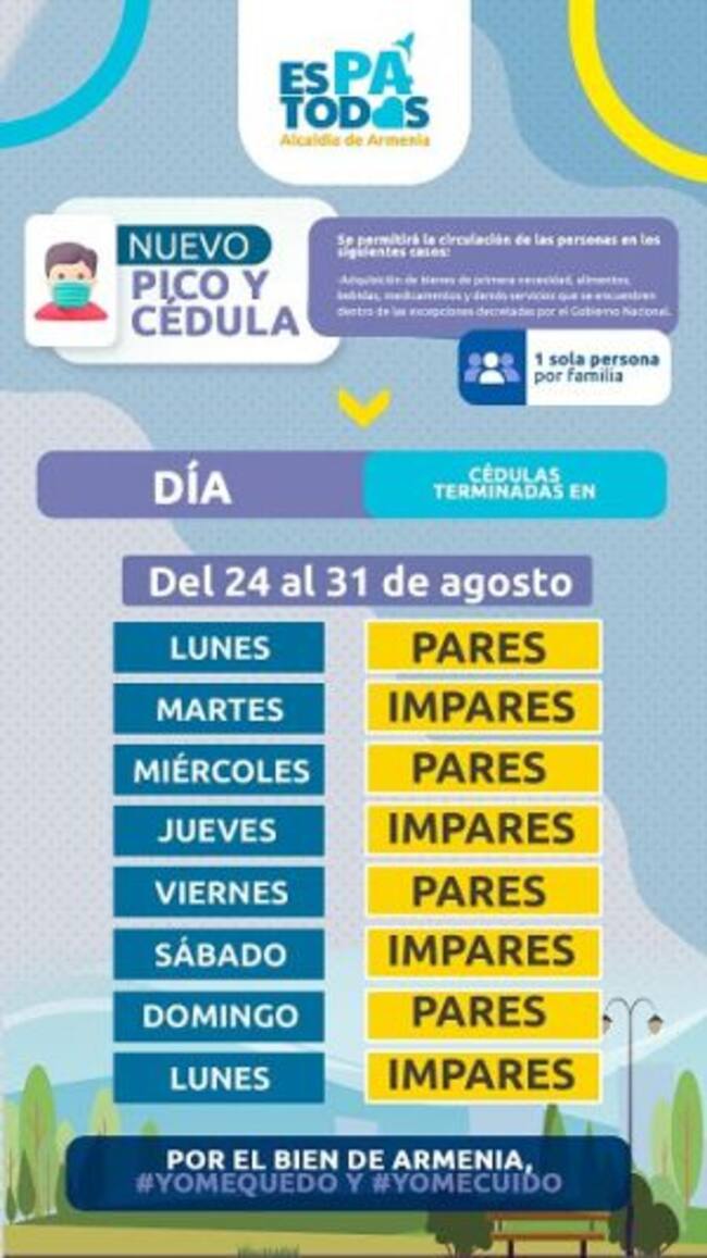 Hoy lunes 24 de agosto del año 2020, el pico y cédula en la capital quindiana es para los números de cédula terminados en número par, es decir 0-2-4-6-8. Con esta medida, se espera que no se presenten aglomeraciones y más contagios de COVID-19, por esta razón solo debe salir una persona por familia.