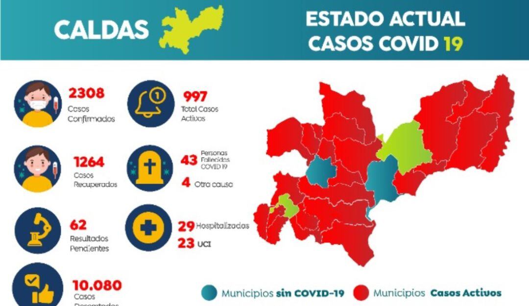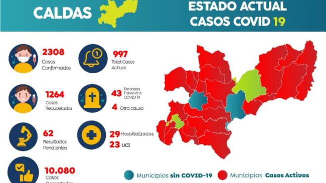 De acuerdo con este informe los contagios se registran así: 18 en Manizales, 30 en La Dorada, 2 en Chinchiná, 1 en La Merced, 1 en Marmato, 1 en Riosucio, 1 en Villamaría y 1 en Viterbo. Así los municipios con nuevos reportes presentan las siguientes cifras:
