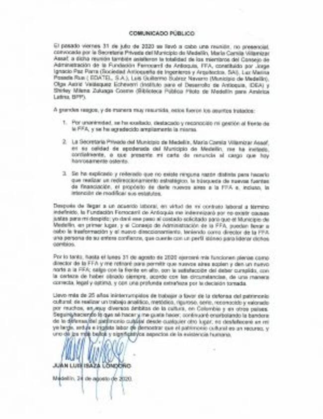 Juan Luis Isaza Londoño, estará como director de la Fundación Ferrocarril de Antioquia hasta el próximo 31 de agosto, la razón es que la delegada de la alcaldía de Medellín para el consejo administrativo, María Camila Villamizar, y quien es la secretaria privada de la administración municipal, le pido al señor Isaza que presentara la carta de renuncia, pese a los buenos resultados, los mismos que le resaltaron en la reunión citada por la funcionaria.
