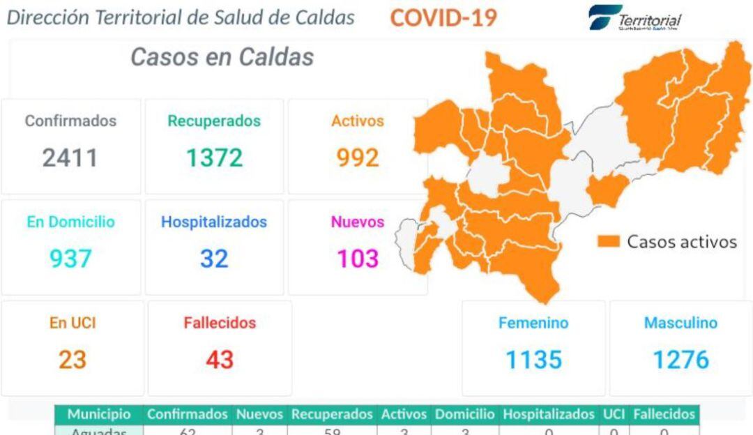 Manizales es el municipio con más casos positivos con 1.266, de estos 667 están activos, 573 se han recuperado, 19 están hospitalizados, 13 en UCI y 22 han fallecido.