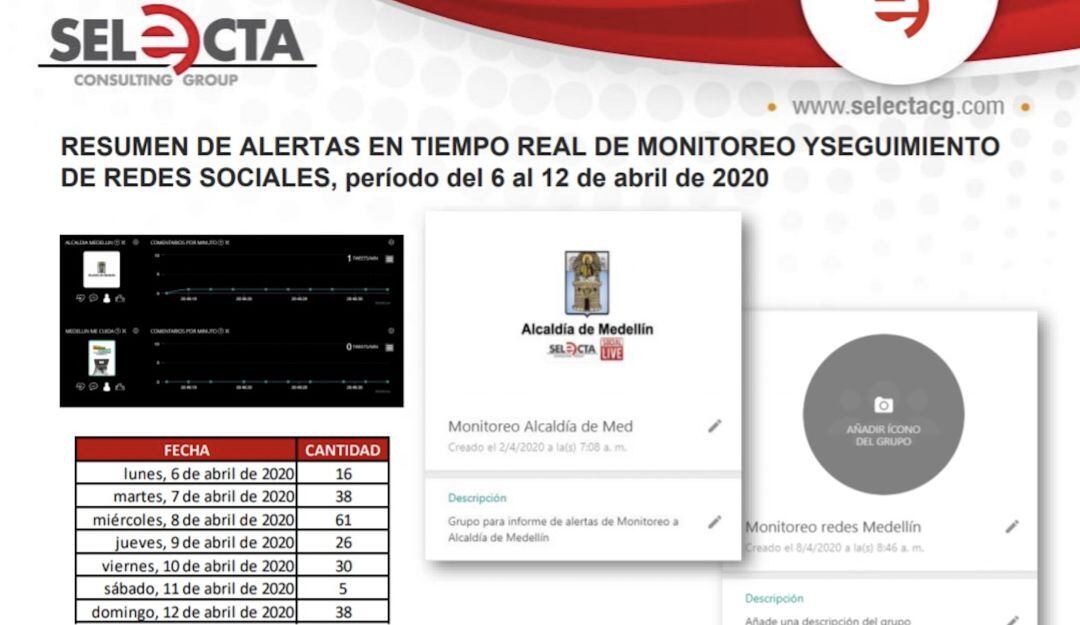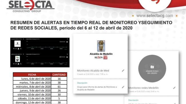 La FLIP tuvo acceso a diez informes que la empresa consultora habría entregado a la alcaldía donde se compilan alertas diarias enviadas por WhatsApp notificando sobre publicaciones de usuarios que hablan de la administración. Según determinaron que dentro de las personas monitoreadas se encuentran los periodistas Clara Giraldo, José Guarnizo, Pascual Gaviria y Ana Cristina Restrepo, además del medio de comunicación Juan Paz.
