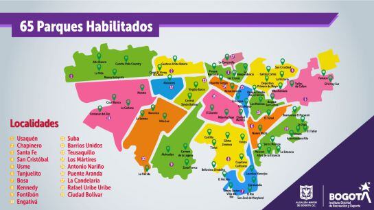 También se habilitarán 65 parques metropolitanos en toda la ciudad: Usaquén (4), Suba (4), Fontibón (3), Engativá (4), Bosa (5), Kennedy (6), Usme (4), Ciudad Bolívar (9), Tunjuelito (2), Antonio Nariño (2), Rafael Uribe (3), Chapinero (2), Santa Fe (3), San Cristóbal (5), La Candelaria (1), Barrios Unidos (1), Teusaquillo (2), Mártires (2) y Puente Aranda (3).