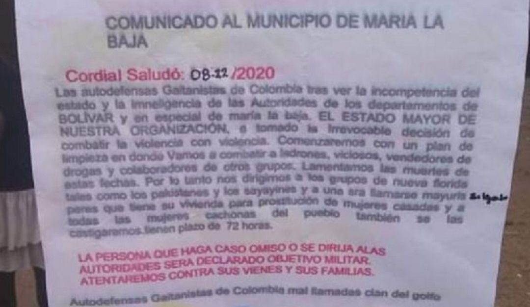 El temor y pánico se han apoderado de las calles del municipio de María La Baja, departamento de Bolívar, tras la circulación de un panfleto que amenaza de muerte a varios grupos de personas de la población.