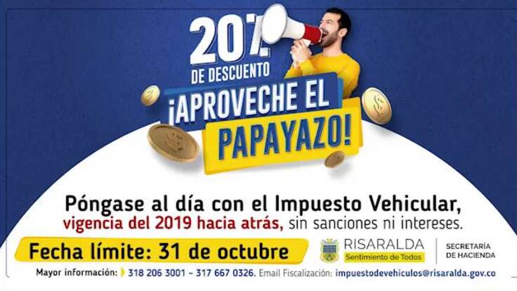 Si usted quiere recibir más información sobre descuentos y beneficios por el pago del impuesto vehicular antes del 31 de octubre o necesita una asesoría, lo invitamos a ponerse en contacto vía mail al correo impuestodevehículos@risaralda.gov.co. También puede comunicarse vía telefónica a los teléfonos 318 2063001 o 317 667 0326.