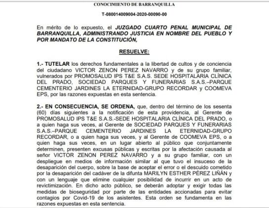 En el fallo de tutela a favor de los familiares de Marilyn Pérez, el Juez indicó que los derechos a la libertad de cultos y de conciencia del padre de la mujer y su grupo familiar fueron vulnerados, además que el cumplimiento "pleno de esta orden no podrá exceder de seis meses, contados a partir de la notificación de este fallo".