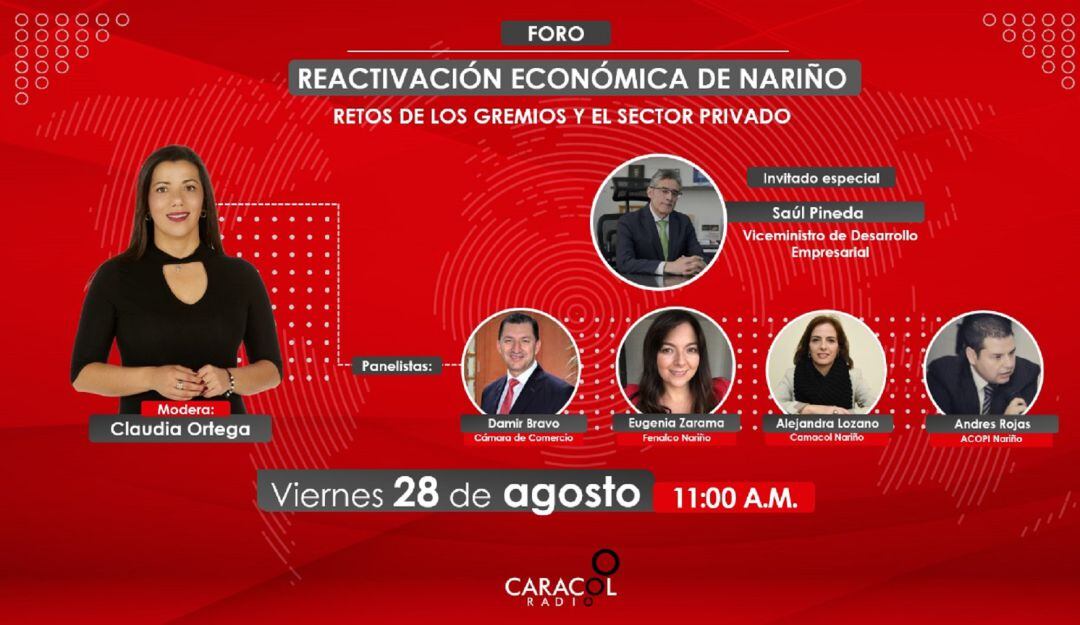 Con la participación del viceministro de desarrollo empresarial Saul Pineda, voceros de Fenalco, Camacol, Acopi y Cámara de Comercio se desarrolla el foro sobre reactivación económica y los retos de los gremios de Nariño en este proceso.