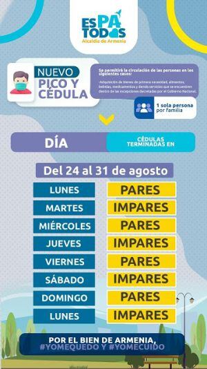 Hoy sábado 29 de agosto del año 2020, el pico y cédula en la capital quindiana es para los números de cédula terminados en número impar, es decir 1-3-5-7-9. Con esta medida, se espera que no se presenten aglomeraciones y más contagios de COVID-19, por esta razón solo debe salir una persona por familia.