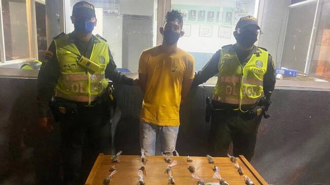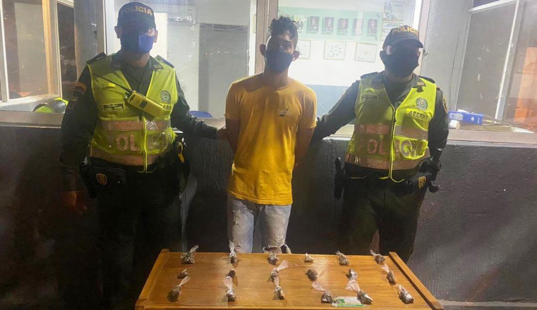 El primer resultado se materializó en el barrio Santa Lucía, donde policías del Cuadrante del CAI San Pedro, capturaron en flagrancia a Camilo Andrés Sánchez Arrieta, de 21 años, conocido como “Camilito”, a quien mediante requisa le fueron halladas 18 dosis de marihuana, listas para su comercialización, cuando departía junto a un grupo de jóvenes, sin acatar las medidas de distanciamiento social y uso de elementos de bioseguridad.