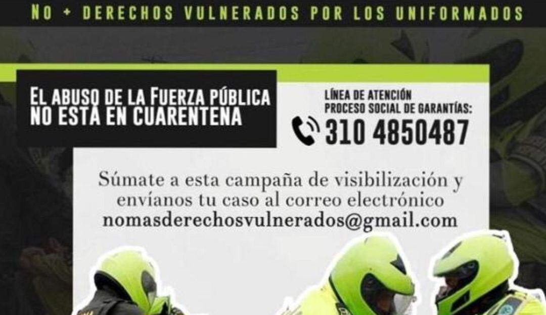 Las personas que tengan denuncias sobre casos de excesos en el uso de la fuerza o autoridad, pueden comunicarse al teléfono de la campaña: 310 485 0487, o escribir al correo nomasderechosvulnerados@gmail.com. Allí, los integrantes de la corporación les darán atención en el proceso social de garantías.