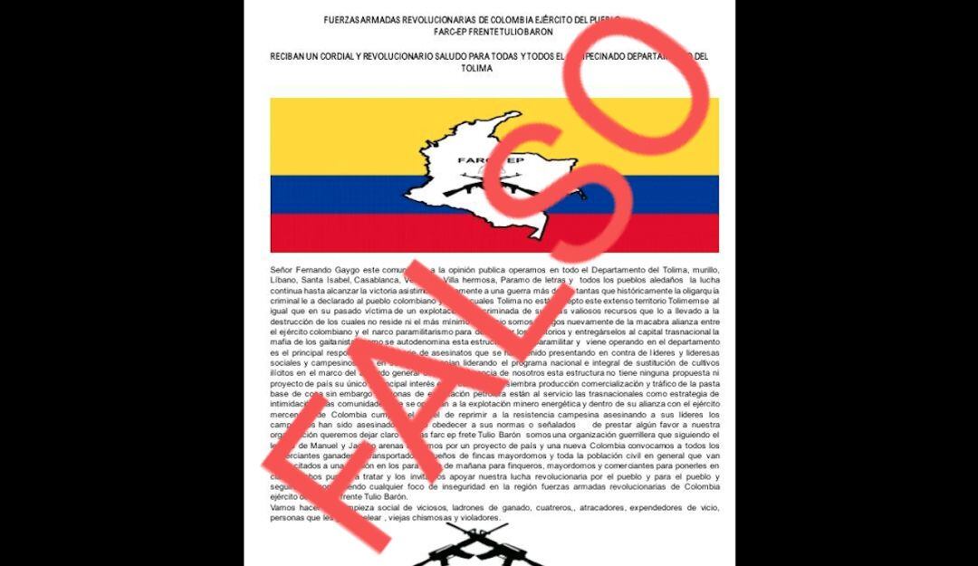 Personal de inteligencia de la Sijin de la Policía Tolima y el Gaula analizaron un panfleto que estaba circulando a través de redes sociales y grupos de whatsapp, en el que delincuentes comunes se hacen pasar como integrantes del desaparecido frente Tulio Varón de la exguerrilla de las Farc.