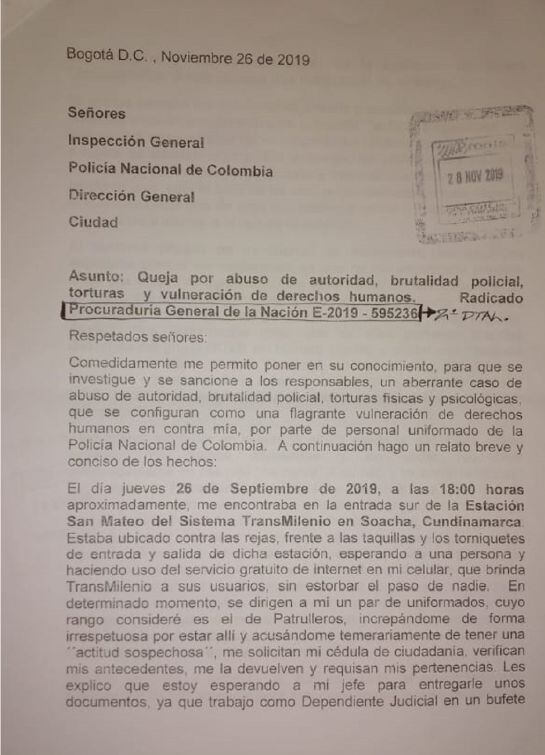 Los hechos ocurrieron el 26 de septiembre, hace casi un año y es precisamente el común denominador en las denuncias de abuso policial en el país: las investigaciones no avanzan o se embolatan. Este es el radicado ante la Procuraduría General.