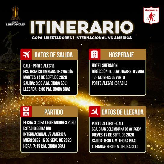 Con un itinerario de 12 horas de duración, bastante complicado por el cierre de cielos en territorio brasileño, el campeón de Colombia debe hacer la ruta Cali-Santa Cruz de la Sierra-Florianópolis- Porto Alegre. Todo porque las autoridades de Porto Alegre tienen cerradas las llegadas de vuelos internacionales a su aeropuerto, de tal manera que deben ingresar primero por Florianópolis y luego arribar a la sede del partido, Porto Alegre.