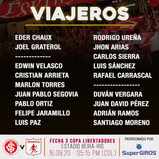 Con las ya señaladas novedades en la nómina desplazad a Porto Alegre América presentaría en su titular, mañana desde las 5:15 p.m. a Eder Chaux, Cristian Arrieta, Marlos Torres, Juan Pablo Segovia, Edwin Velásco, Luis Paz, Rafael Carrascal, Carlos Sierra, John Arias, Duván Vergara y Adrián Ramos.