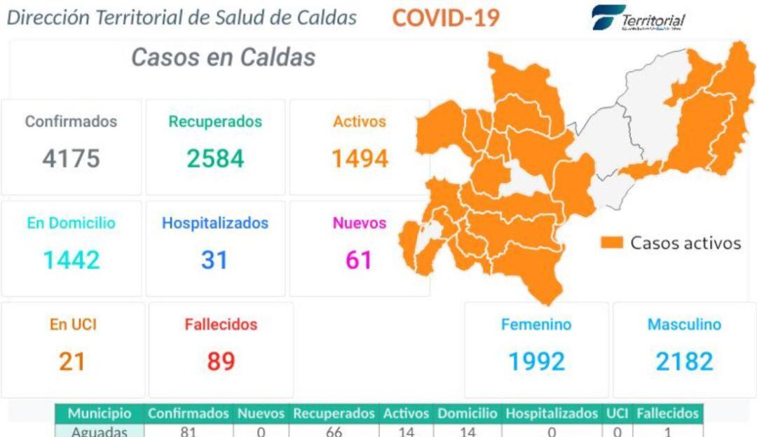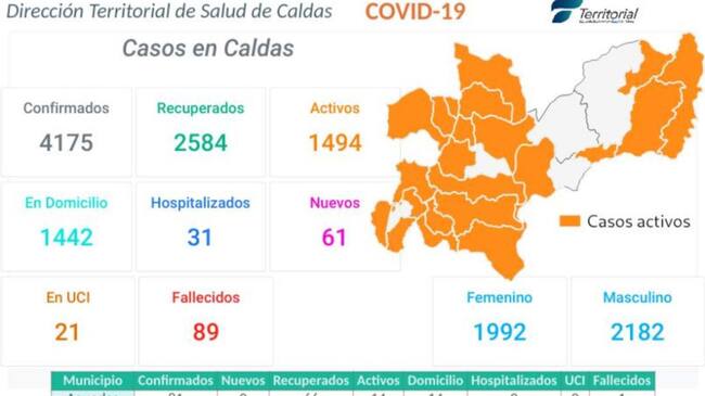Con el nuevo registro Caldas llega a 4.175 personas contagiadas por coronavirus, 1.992 de ellas son mujeres y 2.182 hombres; en total 2.584 se han recuperado, 1.494 aún están activos, 31 hospitalizadas, 21 en UCI y 89 han fallecido por el virus.