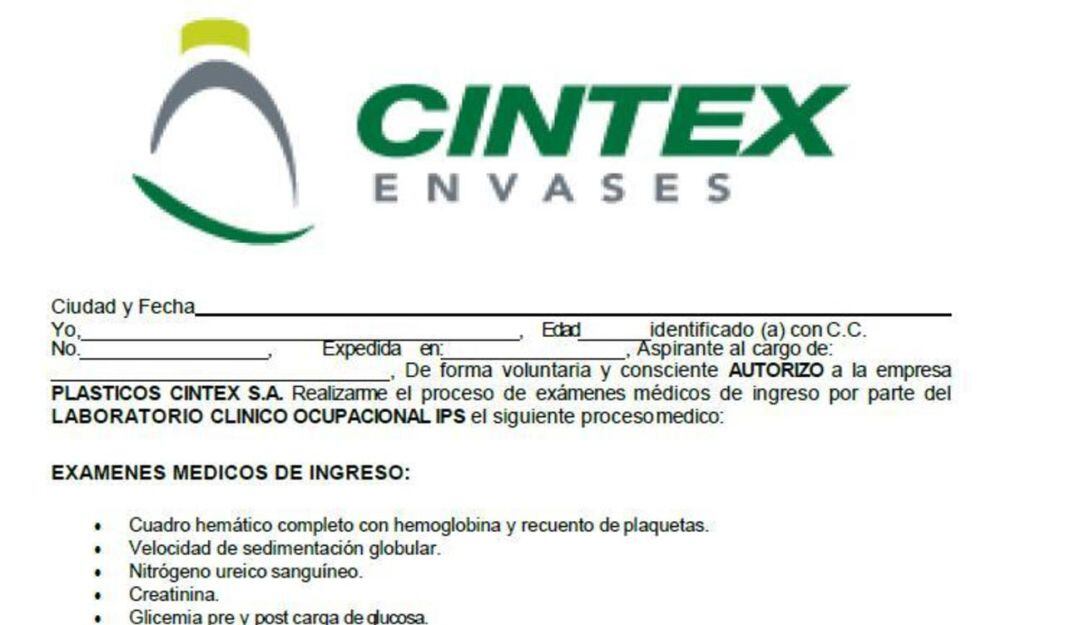 Adjunto a dicho correo, que es firmado por una mujer que se identifica como Claudia Alejandra Corzo, quien dice ser la coordinadora de recursos humanos de dicha empresa de plásticos, envían un formulario para autorizar la realización de unos exámenes médicos en un laboratorio clínico el cual aseguran que está ubicado también en La Virginia.