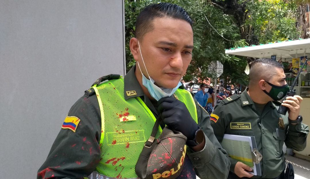 Un uniformado de la Policía Metropolitana de Neiva y el camarógrafo oficial de la Alcaldía local, resultaron heridos en su rostro y cuerpo, luego de ser atacados con objetos contundentes y bombas de pintura durante las protestas que se cumplen a esta hora en la capital del Huila.