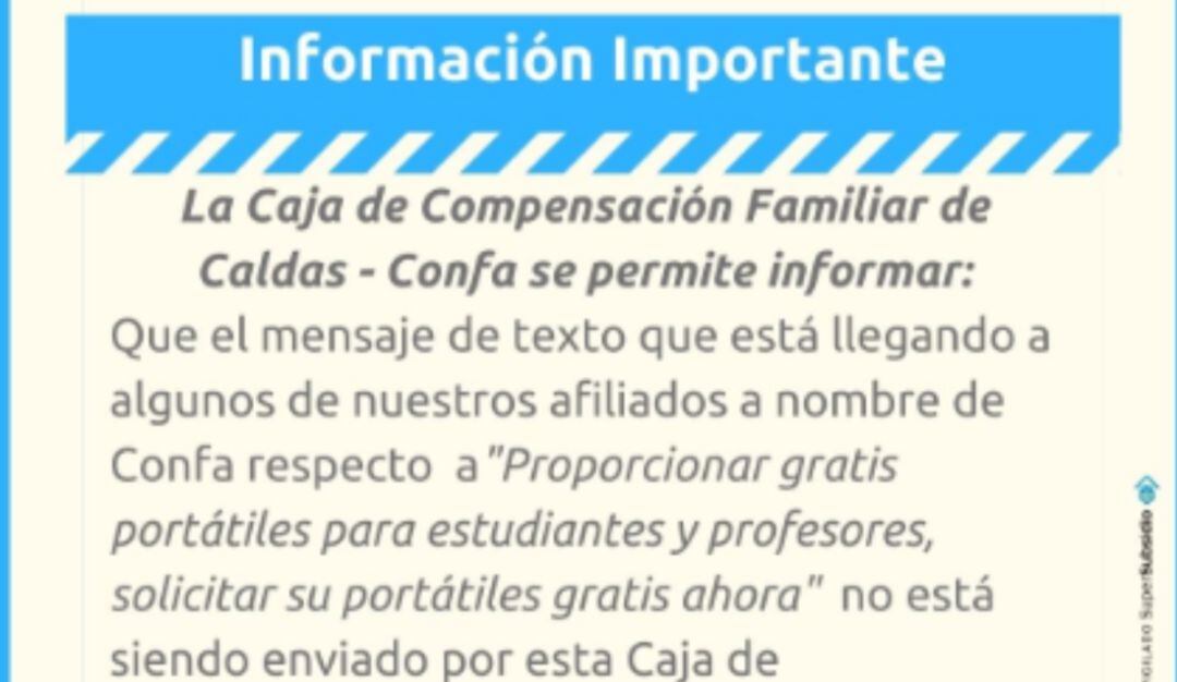 La Caja de Compensación Familiar de Caldas (Confa) pide a los ciudadanos no creer en un mensaje de texto que está llegando a los afiliados de la entidad en el cual aseguran que están otorgado computadores portátiles, y que para ser parte de los beneficiados, deben llenar un formulario con sus datos personales.