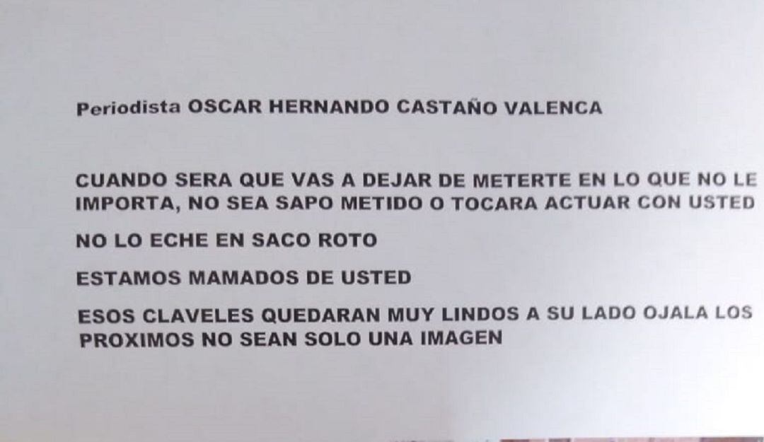 El periodista Oscar Castaño y director del programa de tv Orientese, denunció que hombres que se movilizaban en una motocicleta dejaron un panfleto en su vivienda, en él le amenazan de muerte por su trabajo de denuncia en la subregión del oriente de Antioquia.