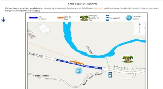 Cierre parcial en la Carrera 1 Oeste en acceso a la vereda Atenas: Intervención sobre el carril derecho de la vía Cali-Atenas sentido este-oeste; los vehículos deberán circular en paso uno a uno por el carril izquierdo de la vía.