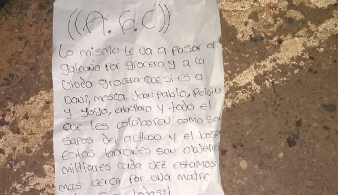 Al lado de los cuerpos sin vida también se encontraba una hoja con un mensaje intimidante alusivo a las Autodefensas Gaitanistas de Colombia, advirtiendo que lo mismo le iba a pasar a otras personas declaradas como objetivo militar en la región.