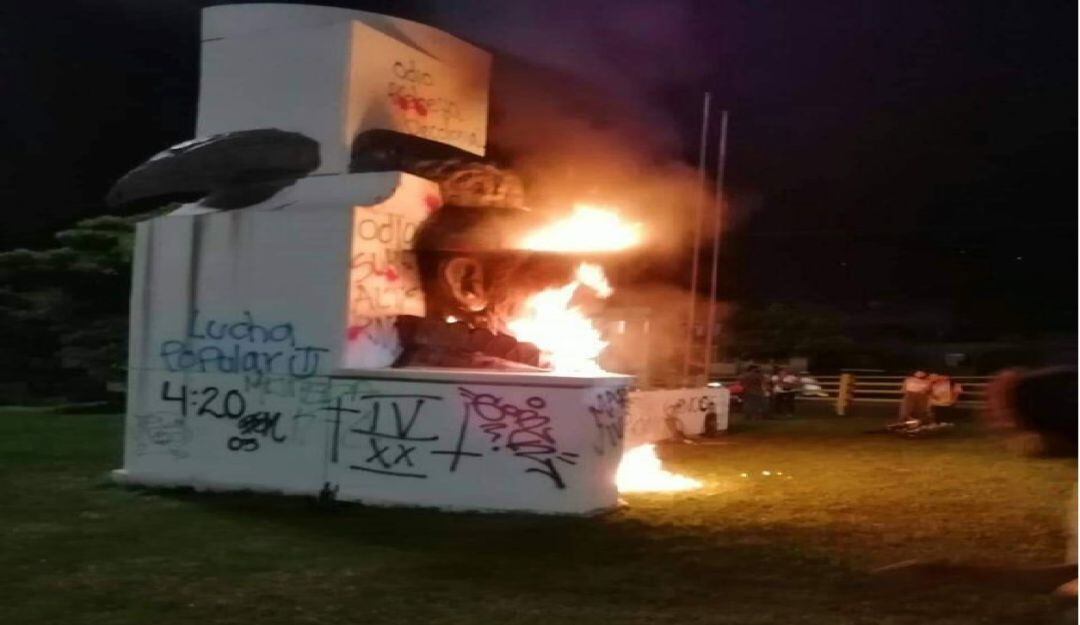 La acción fue desarrollada por un grupo de jóvenes que desde tempranas horas se reunieron a lanzar arengas contra la conquista española y posteriormente decidieron prenderle fuego al monumento que no sufrió mayores daños por tratarse de una efigie en bronce. Adicionalmente pintaron letreros ofensivos en el monumento.