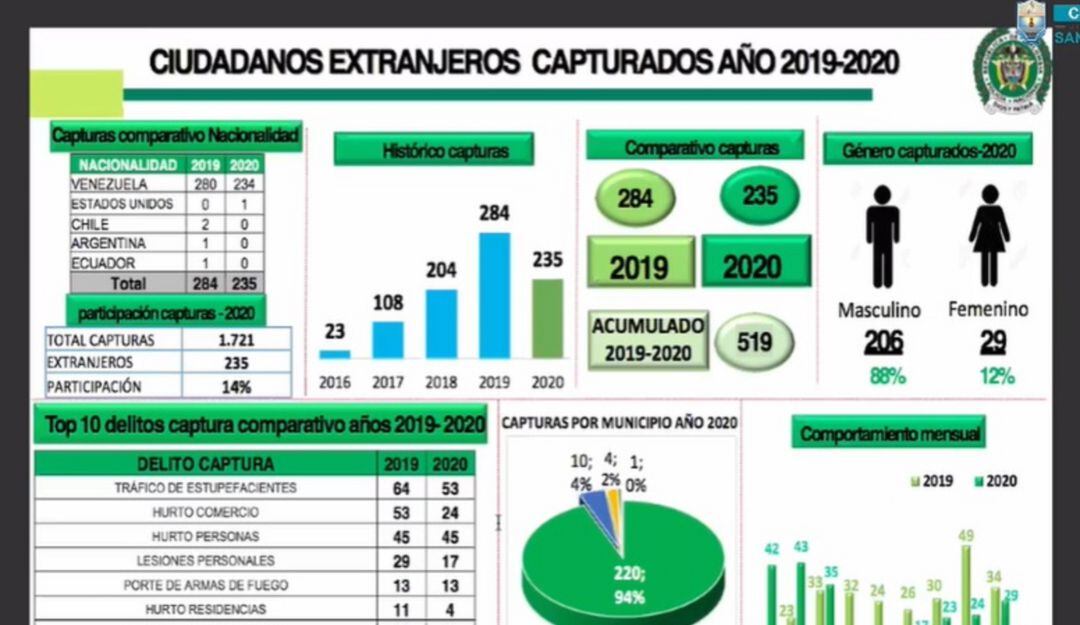 Dice el alto oficial que en el top 10 de los delitos más cometidos por los venezolanos está el "tráfico de estupefacientes y en lo corrido del 2020 se han capturado a 53 personas, hurto a comercio 24, hurto a personas 45, lesiones personales 17, violencia intrafamiliar 17 y porte ilegal de armas de fuego 14".