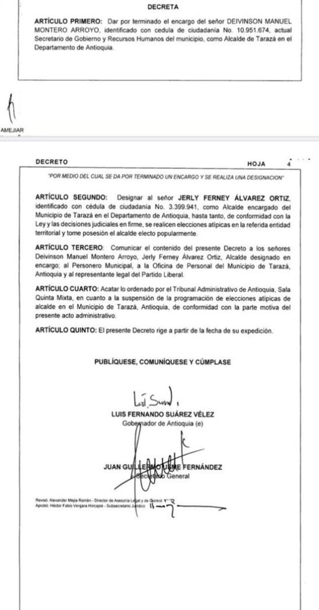 Mediante el decreto también se notificó la salida del cargo del hasta hoy alcalde encargado, Deivinson Montero quien asumirá nuevamente su cargo como secretario de gobierno de Tarazá.