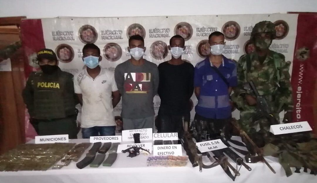 Los capturados llevaban en su poder cinco armas largas, un arma corta, cuatro proveedores, abundante munición de diferente calibre, una mina antipersonal, comunicaciones y dinero en efectivo, material que les fue incautado por tropas del Ejército Nacional.