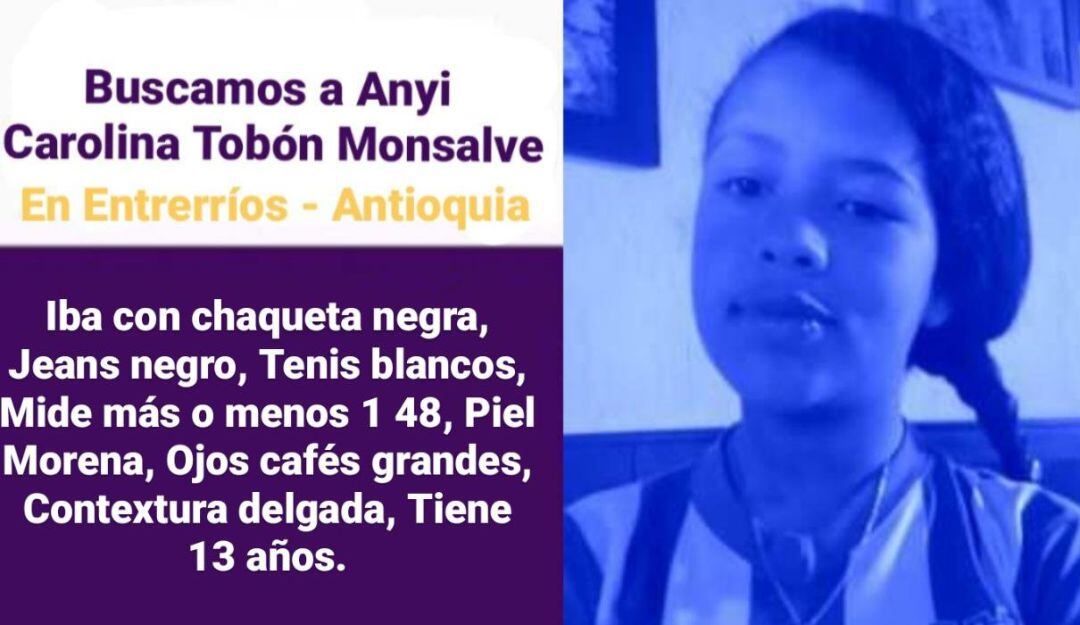 Anyi Carolina Tobón de 13 años de edad salió de su casa el pasado 29 de septiembre a un semillero del municipio de Entrerríos y desde ese momento sus abuelos, que son quienes la tienen a su cargo, no saben nada de ella.