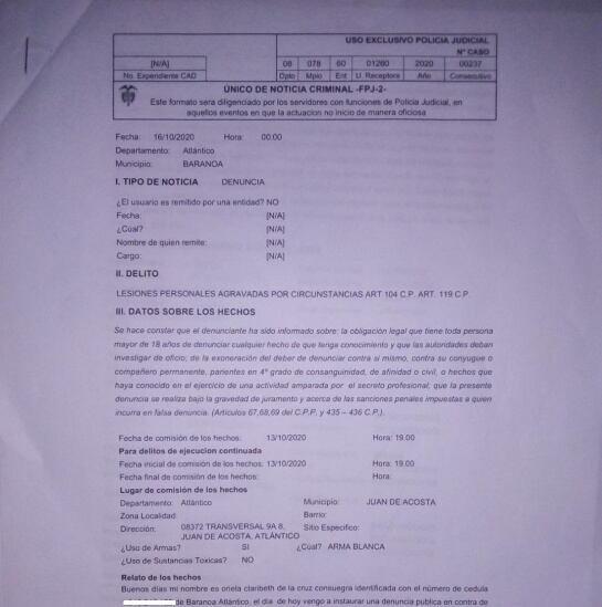 Según la mujer, el hecho se presentó en una finca en el municipio de Juan de Acosta