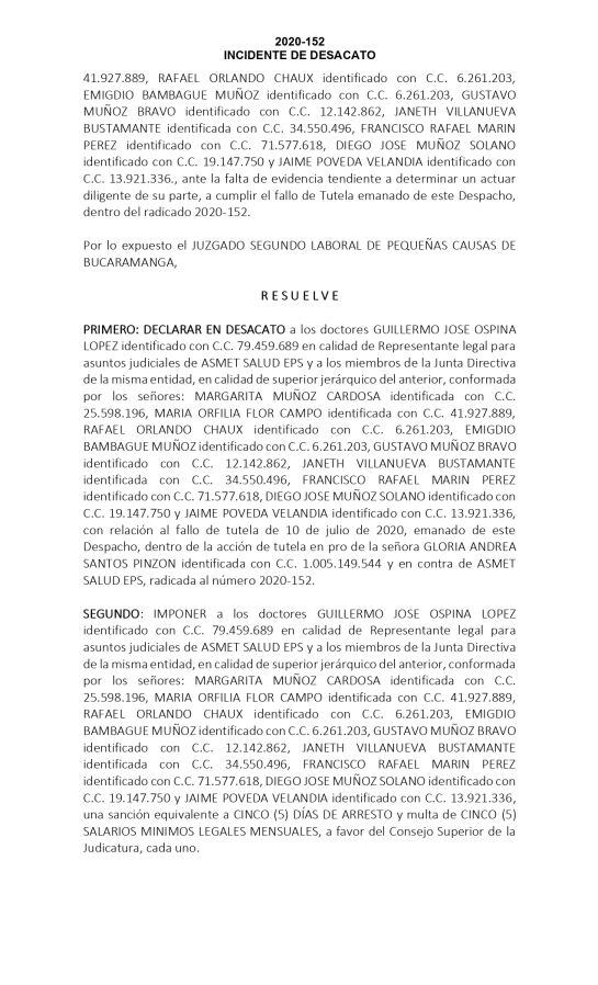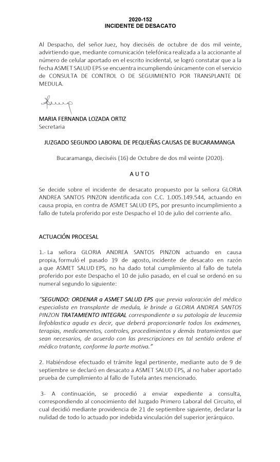El concejal de Bucaramanga, Danovis Lozano, quien ha seguido este caso explicó que el Juzgado Segundo Laboral de Bucaramanga ordenó el arresto de Guillermo José Ospina López, representante legal de Asmet Salud y la junta directiva por cinco días de cárcel tras desacatar la tutela. Ésta ordenaba a la EPS realizar la entrega de medicamentos y el inicio del transplante de médula ósea que ella necesita.