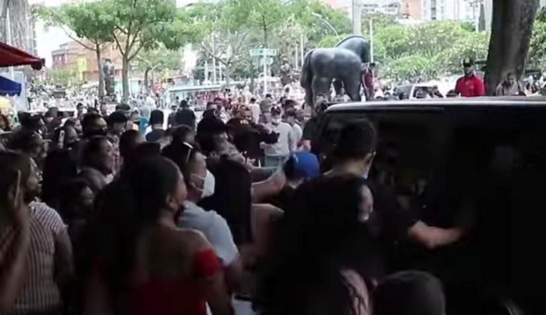 El artista, que se encontraba en un edificio a un costado de la Plaza Botero, salió de la estructura y en ese momento, cientos de personas a gritos se lanzaron sobre él, incluso algunos se quitaron los tapabocas para tomarse alguna foto donde se pudiera ver al artista.
