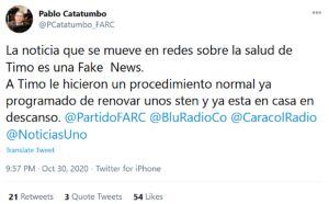 El senador del partido Farc, Pablo Catatumbo, aclaró la información respecto a la salud del líder del partido Rodrigo Londoño Echeverri, Timochenko, a través de su cuenta de Twitter en la que indicó: “La noticia que se mueve en redes sobre la salud de Timo es una Fake News.A Timo le hicieron un procedimiento normal ya programado de renovar unos sten y ya está en casa en descanso”.