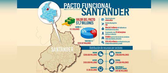 Los recursos del pacto funcional quedaron distribuídos así: para el transporte: $1 billón de pesos, turismo $209.830 millones, educación $185.800 millones, vivienda $114.534 millones, deporte $100.000 millones, y agua potable y saneamiento básico $49.182 millones