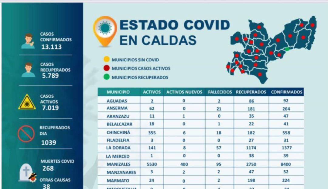 Con este registro Caldas llega a 13.113 personas contagiadas por coronavirus, 5.789 se han recuperado, 7.019 están activos. De los infectados 61 están hospitalizados y 54 en UCI. A la fecha 268 personas han fallecido por la enfermedad.
