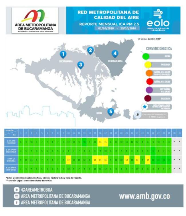 La calidad del aire en el Área Metropolitana de Bucaramanga durante el mes de octubre, mejoró. Así lo indica el reporte del AMB tras el monitoreo realizado en las estaciones entre el 1 y el 29 de octubre.