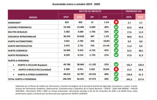 Sin embargo, señalan que dos delitos presentan un incremento este año si se compara con 2019, entre enero y octubre. El homicidio aumentó 1,5% al pasar de 823 en 2019 a 835 este año, 12 hechos más.
