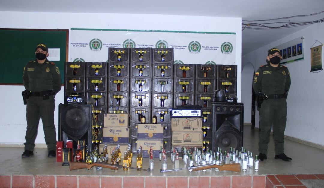 En el lugar se logró la incautación del licor que estaba siendo comercializado en este caso cerveza, aguardiente, ron, wiski, al igual que equipos de sonido, silletería y dos armas de fuego tipo escopetas que los participantes dejaron abandonadas.