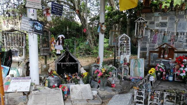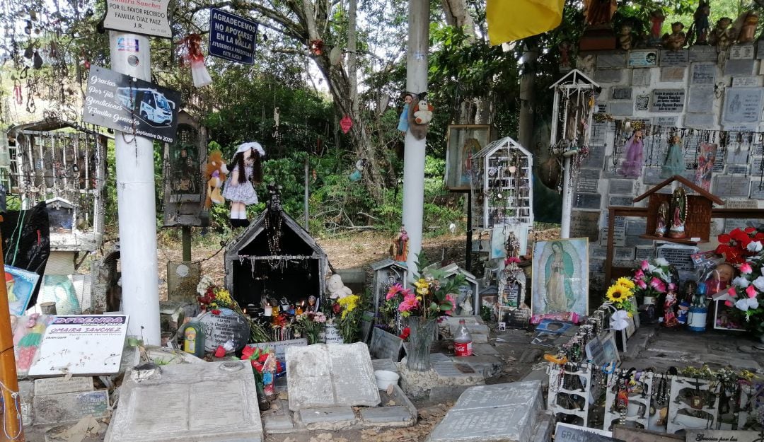 Placas con mensajes de acción de gracias, veladoras derretidas, camándulas y otro tipo de elementos encuentran los turistas en uno de los puntos más significativos de Armero, la tumba de Omaira Sánchez.