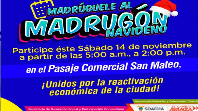 "La invitación es para todos los soachunos a que participen y se vinculen en este primer Madrugón Navideño Nacional. Se espera en el mes de diciembre una nueva feria navideña, para seguir comprando productos de la ciudad de excelente calidad y aportando a los microempresarios de la ciudad", dijo Saldarriaga.