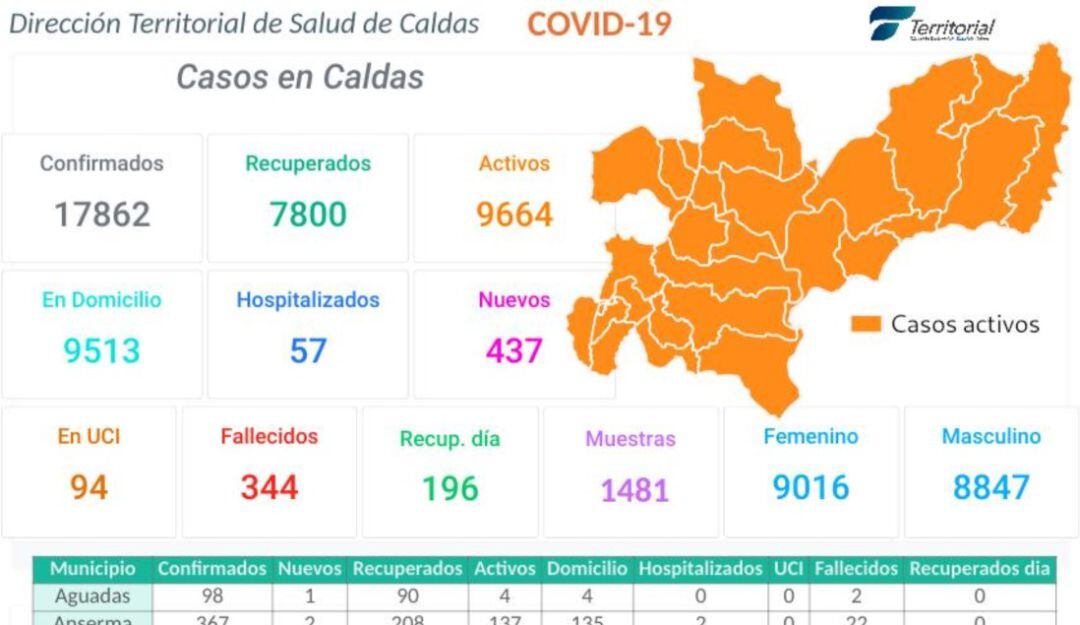 La Territorial de Salud de Caldas confirmó 437 nuevos casos positivos de coronavirus y 2 personas perdieron la vida a causa de la enfermedad en los municipios de Manizales (1) y La Dorada (1).